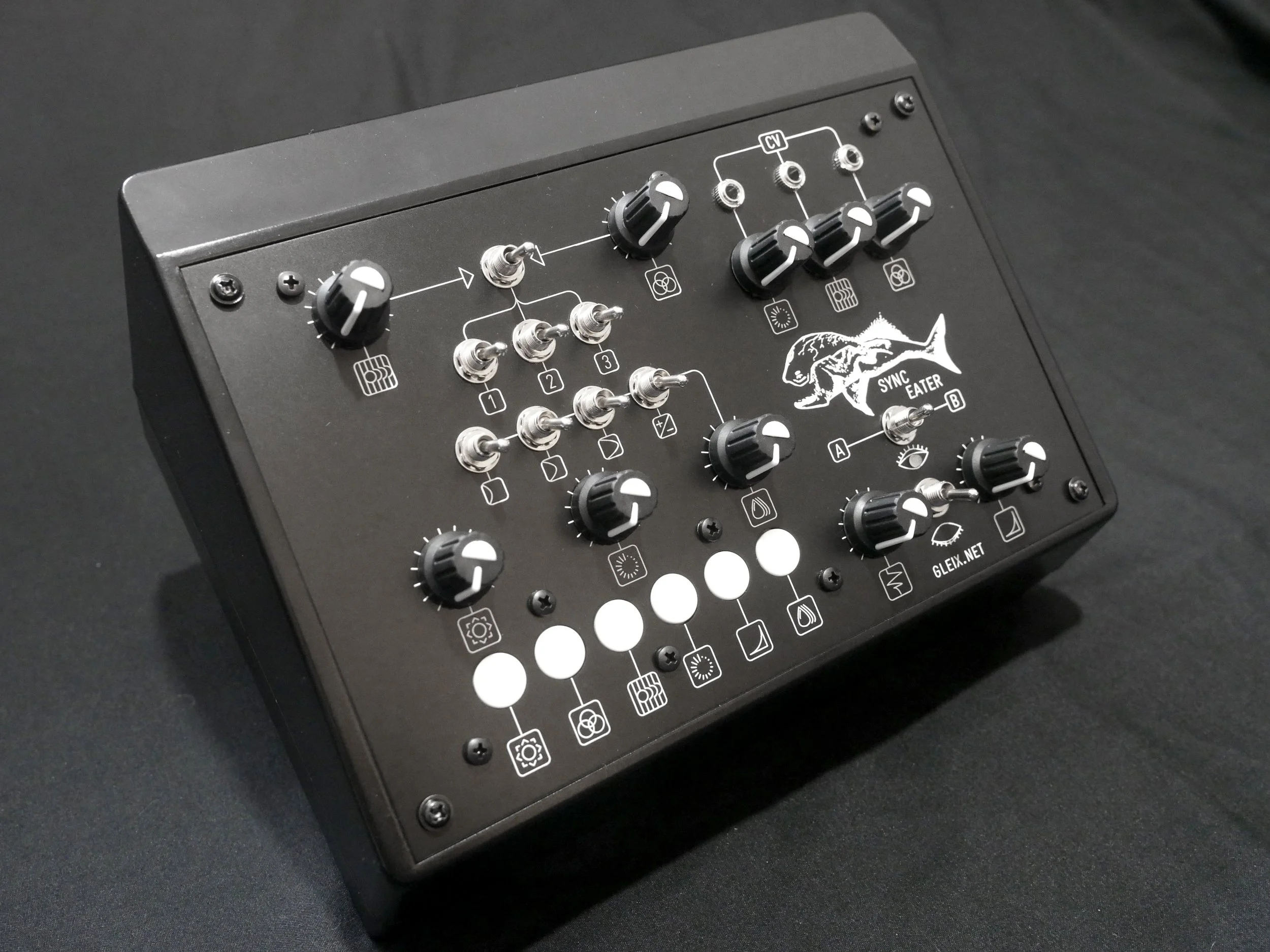 The Sync Eater is an analog video effects processor which boasts a series of knobs, switches, buttons, and CV inputs making it suitable for both studio & live use. With a focus on glitch visuals achieved through experimentation, it easily slots into any composite video workflow where a classic distorted analog style is desired. This release model utilizes custom PCBs, PCB mounted controls, and a silkscreen printed front panel. The Sync Eater uses ready-available parts which shouldn’t become scarce any time soon.